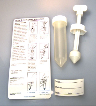CS1無菌組織研磨器通過剪切和壓縮作用的組合來生產均質物。由聚丙烯(管)制成;杵是30%的玻璃填充PP,瓶蓋是HDPE。在密封容器內研磨組織,以最大限度地降低個人接觸的風險 - 消除接觸樣品氣溶膠。研杵尖端的模制磨料表面不會留下任何沉積物來阻礙樣品檢查。窄杵消除了其他類型的研磨機常見的樣品溢出的可能性。所有產品均采用易于打開的 Tyvek 包裝進行伽馬滅菌。每套研磨器都配有一個完全組裝的研杵、一個帶實心頂蓋的錐形樣品管、一個不干膠識別標簽和一張說明卡。