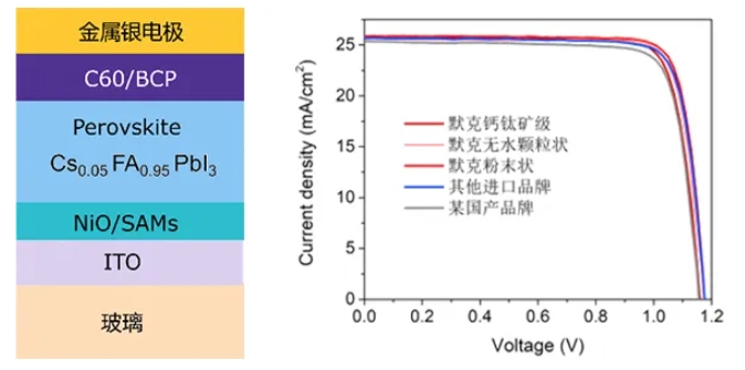 在實(shí)際測試的過程中,使用默克純度為99.999%的碘化鉛材料(貨號(hào)203602),相對于其他品牌的材料,轉(zhuǎn)換效率(PCE)有著明顯的提升。與其他進(jìn)口品牌相比,該產(chǎn)品的實(shí)際器件表現(xiàn)同樣占據(jù)明顯的優(yōu)勢。