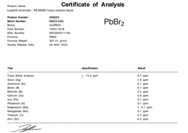 高純金屬鹽材料是默克(Sigma-Aldrich®)一直以來的明星產(chǎn)品,擁有純度高,批次間一致性好等特點(diǎn),并且擁有多種級(jí)別可供選擇。這些產(chǎn)品全部由默克位于美國伊利諾伊州Urbana的工廠生產(chǎn),該工廠建于1995年,至今一直穩(wěn)定地供應(yīng)著不同種類的高質(zhì)量金屬無機(jī)鹽。在鈣鈦礦太陽能電池的應(yīng)用中,作為吸光層最常使用的材料,碘化鉛對于鈣鈦礦器件的使用效率和性能有著明顯的影響,是默克熱銷的明星產(chǎn)品之一。
