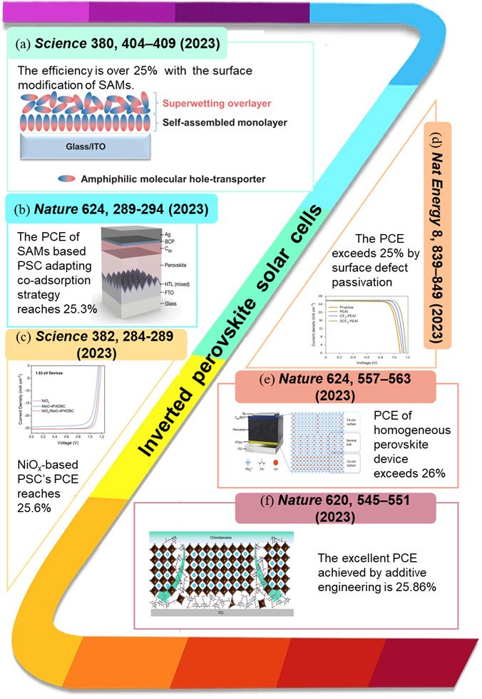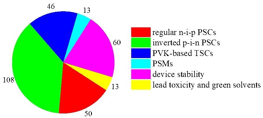 分類詳細(xì)介紹了正式n-i-p PSC、反式p-i-n PSC、TSC、PSM、器件穩(wěn)定性、鉛毒性與綠色溶劑六大分類在2023年的研究進(jìn)展(圖3)。