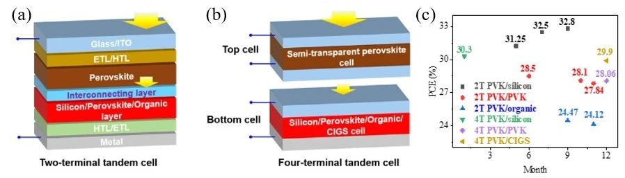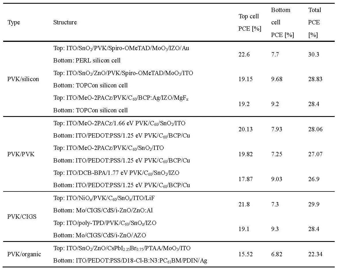 (3)TSC:目前,PVK基的TSC的PCE仍遠(yuǎn)低于理論極限。開發(fā)低損耗互連層并提高子電池的性能將進(jìn)一步提高基于PVK基的TSC的PCE。