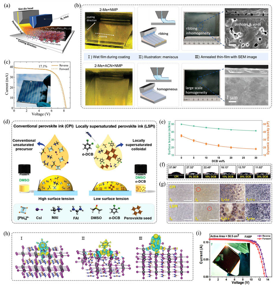 PSC的快速發(fā)展使其成為最有前景的新興光伏技術(shù)。在實(shí)驗(yàn)室規(guī)模的小面積PSC中,它們在效率和穩(wěn)定性方面取得了顯著進(jìn)展。然而,PSC必須升級到模塊規(guī)模,才能成功地向商業(yè)化過渡。在過去的研究中,研究人員已經(jīng)提出了幾種可擴(kuò)展的制造方法來制造PSM。在這一節(jié),簡要總結(jié)了PSM可擴(kuò)展制造在2023年的進(jìn)展,包含刮刀涂覆(圖7)、縫模涂布(圖8)、噴涂法(圖9(a-c))、噴墨打印法(圖9(d-f))、絲網(wǎng)印刷法(圖9(g-h))和氣相沉積(圖10)。
