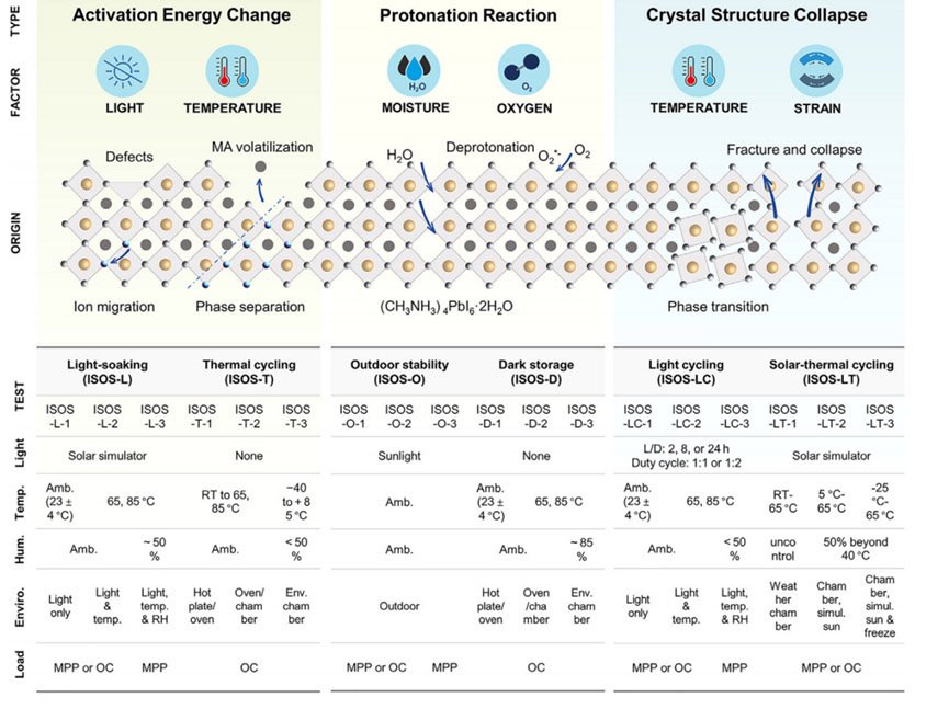 圖15 鈣鈦礦材料降解示意圖以及鈣鈦礦材料和器件性能的ISOS協(xié)議概述