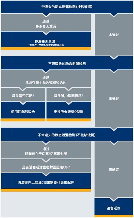 靜態測試時無需按壓移液鍵,即活塞不移動,這僅能用于確定整個移液器系統是否存在泄露,無法判斷是否活塞組件的問題導致泄露。